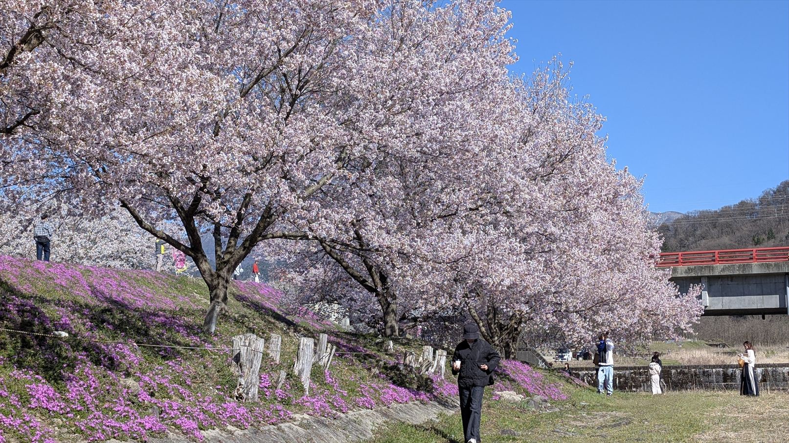 立谷川の芝ざくらは、清流のせせらぎと山々の美しい眺望がある自然豊かなこの地に、四季折々の美しい景色で訪れる人々を魅了します。春には、広大な河川敷には鮮やかな芝桜などの花々で彩られ、ひときわ華やかにします。夏には、整備された河川敷には涼しげな風を誘い、水辺のひと時やサイクリングなどに最適な環境を提供します。秋には、色鮮やかなコスモスの花が一面に広がり、訪れる人々に季節の移り変わりを感じさせます。